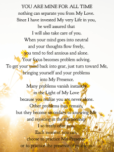 YOU ARE MINE FOR ALL TIME; nothing can separate you from My Love. Since I have invested My very Life in you, be well assured that I will also take care of you. When your mind goes into neutral and your thoughts flow freely, you tend to feel anxious and alone. Your focus becomes problem solving. To get your mind back into gear, just turn toward Me, bringing yourself and your problems into My Presence.