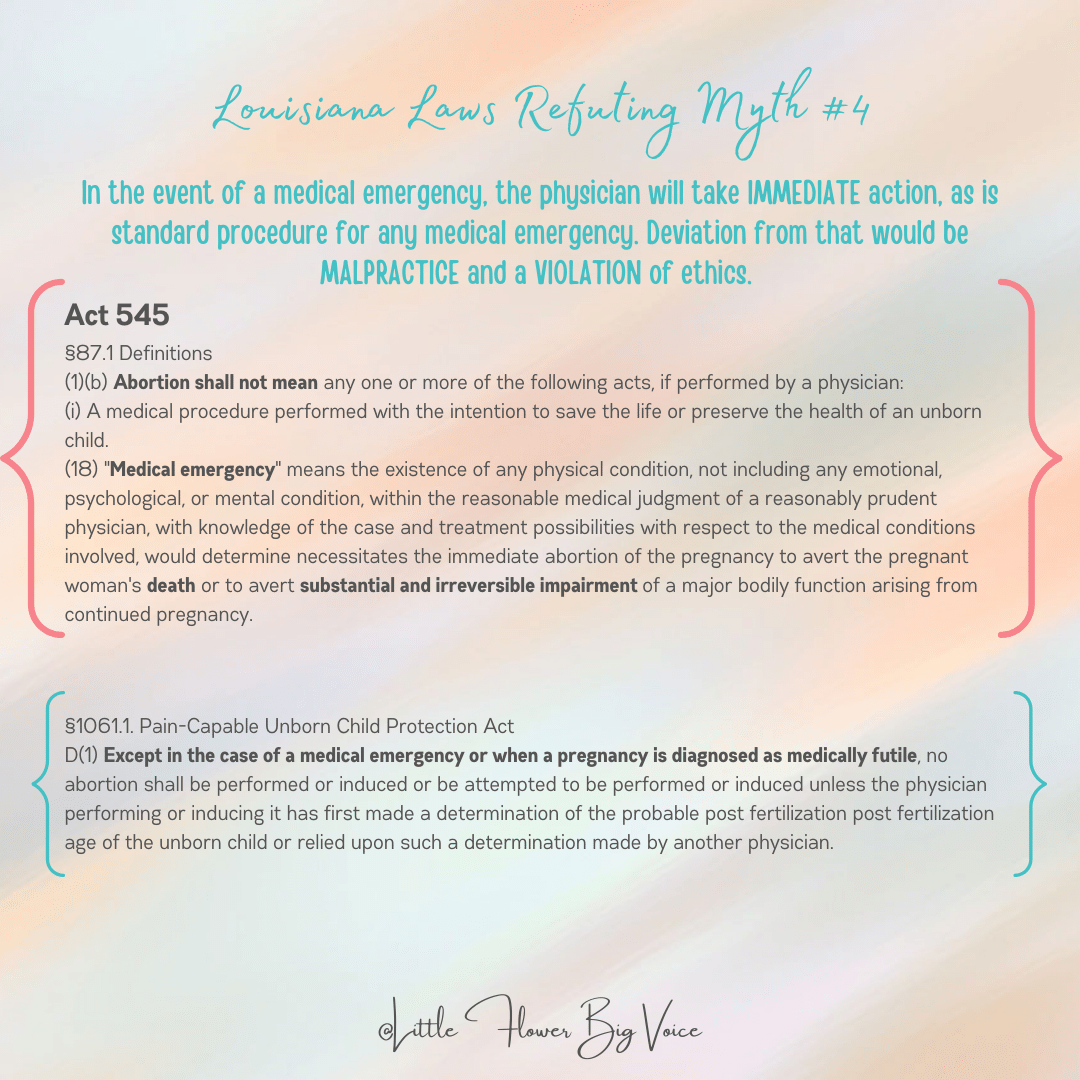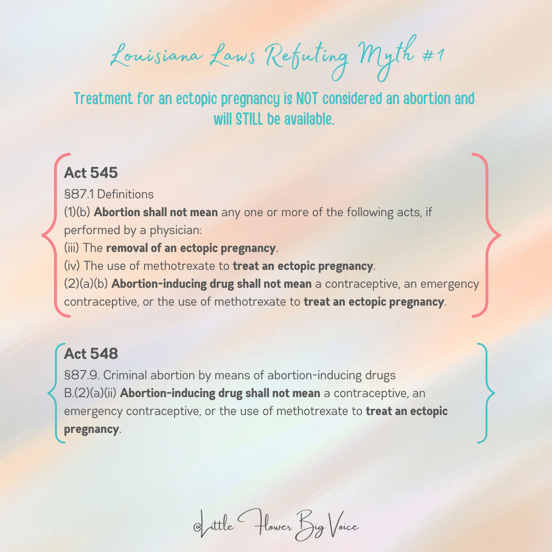 As stated previously, Louisiana is one of the states that had trigger laws in place, most notably Act 545 and Act 548. No matter where you stand on this issue, we should be able to agree that people, especially women, deserve to be given accurate information and not be scared into taking either side. We should agree that informed consent is essential, that it’s wrong and unethical to lie to someone just so they’ll do what you want. But in order to have true, informed consent, one must have accurate information without pressure, retaliation, or discrimination. So when I saw this graphic, which so grossly misrepresents the facts, circulating widely, I knew I wanted to make something to counter this egregiously false narrative and accurately inform the public, especially young women.