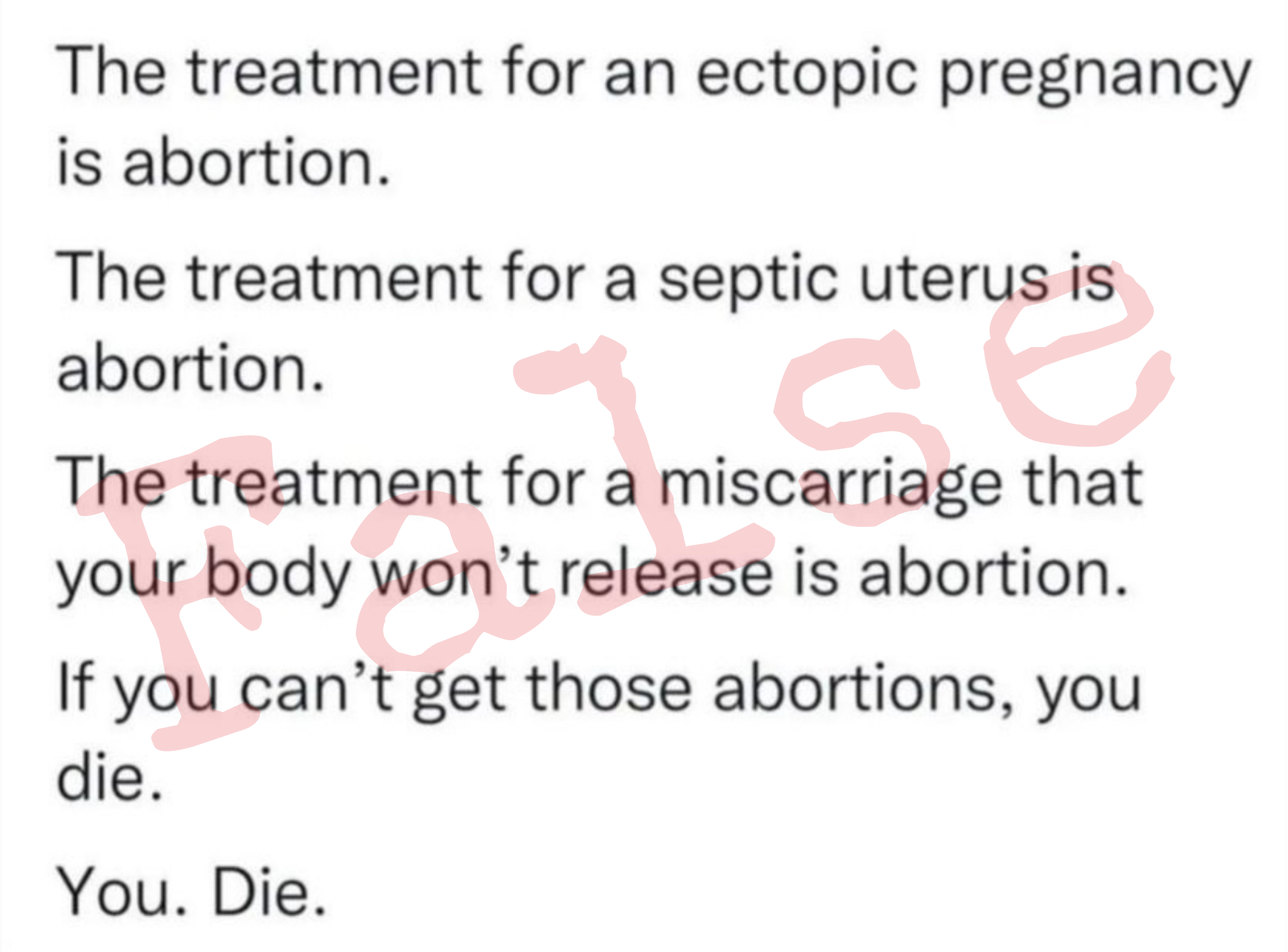 Not only is the graphic above completely inaccurate (I added the word false to it), those very things it mentions (ectopic pregnancy, miscarriage) are specifically cited in the laws as exceptions. There is no excuse for such brazen untruths other than to push propaganda. This is fear mongering at its worst.