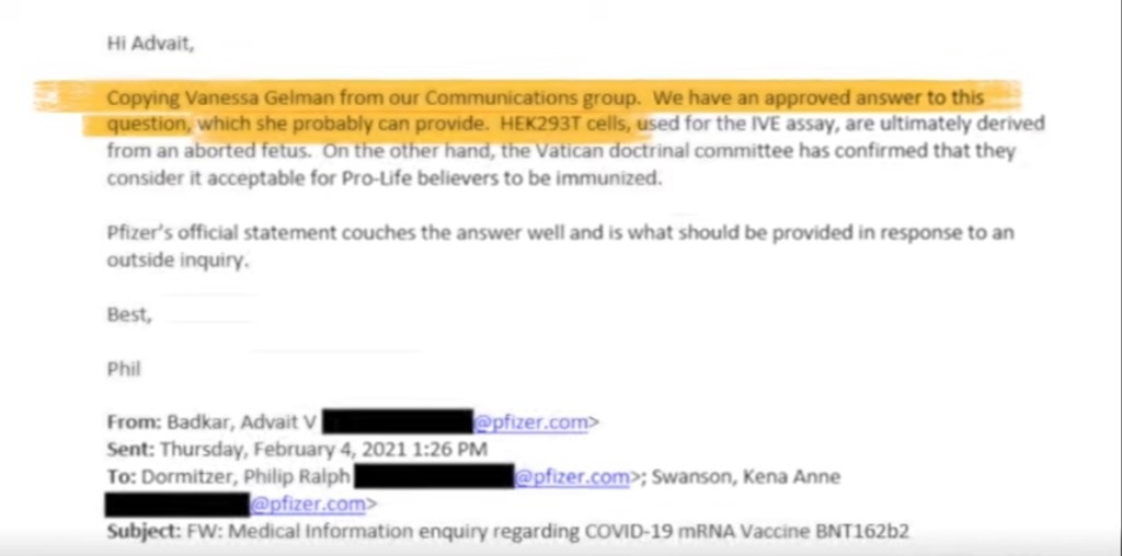 Project Veritas has released a video in which a whistleblower from Pfizer shares internal emails by high ranking executives where they discuss the fact that aborted fetal cells were in fact used, but they don’t want that “out there”.
